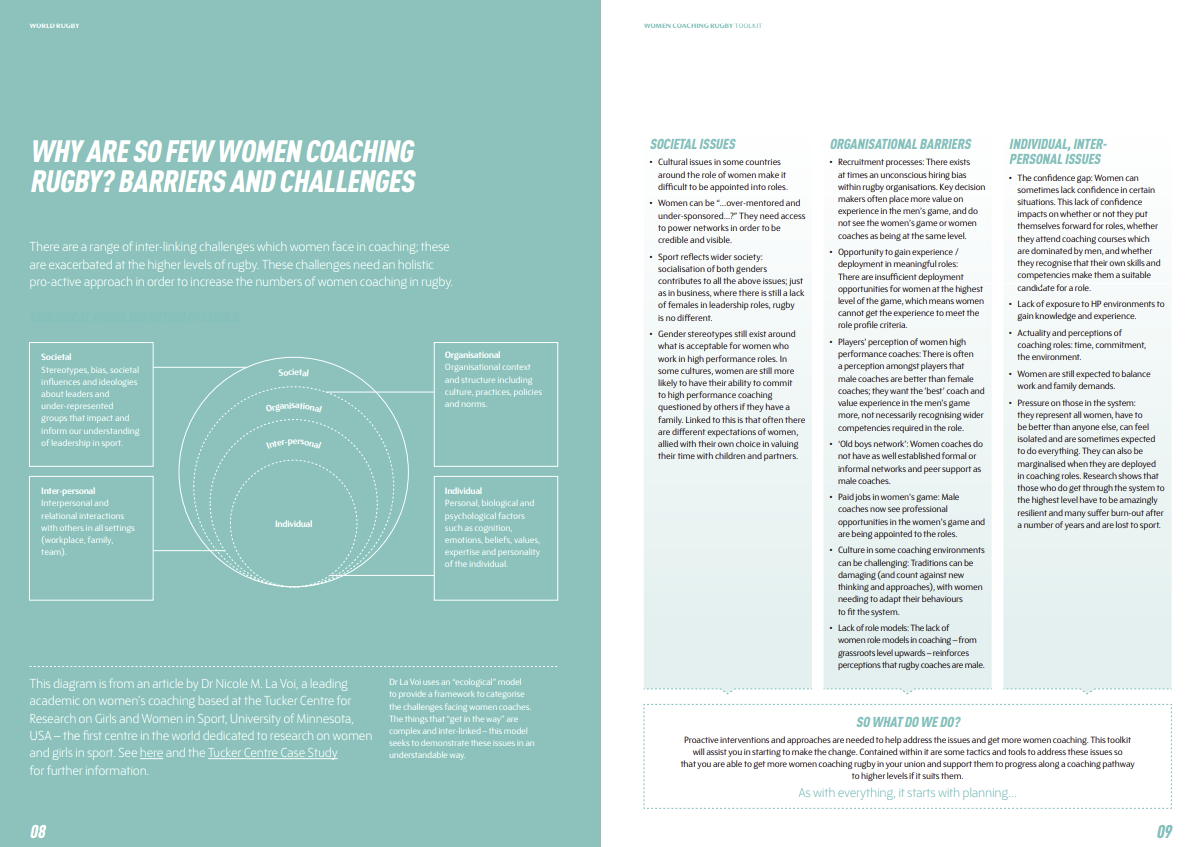 What does this look like practice and in terms of gender? Well, World Rugby have an engaging website to showcase their work, perhaps most impressive for me is their Women Coaching Rugby Toolkit “developed by World Rugby as an aid to unions and regions in recruiting, developing and retaining more women rugby coaches at every level of the game.” I very much like the use of Dr Nicole M. LaVoi’s (and colleagues) ecological model, as screen grabbed here. The individual, organisational, inter-personal and societal layers of this model seem to connect neatly the messy and broad range of inter-linking challenges which women face.