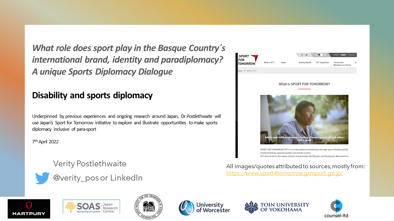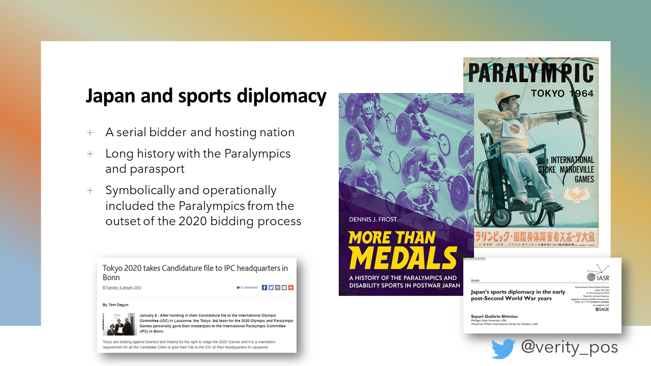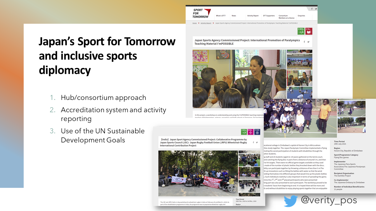 “Underpinned by previous experiences and ongoing research around Japan, Dr Postlethwaite will use Japan’s Sport for Tomorrow initiative to explore and illustrate opportunities to make sports diplomacy inclusive of para-sport”
