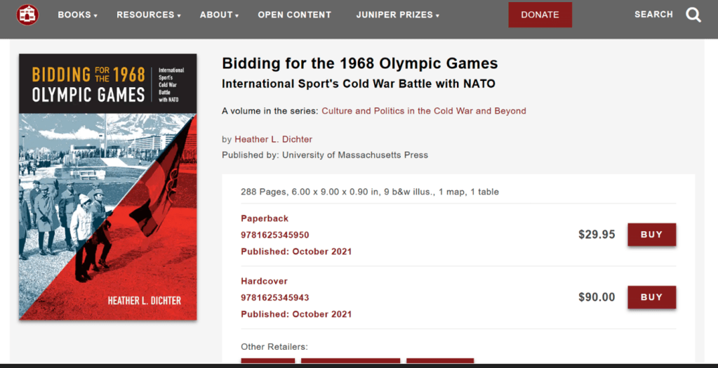 Bidding for the 1968 Olympic Games: International Sport’s Cold War Battle with NATO – https://www.umasspress.com/9781625345950/bidding-for-the-1968-olympic-games/ – this is the publisher’s webpage and the book is available to buy via most retailers around the world. Prices will vary and differ from both screengrabs below, mostly depending on the exchange rates.