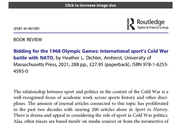First of all, before getting to the book, a huge shout out to Lisa and others at Sport in History for doing a marvellous job of compassionately commissioning and patiently editing reviews for the journal Sport in History. I am a proud member of the British Society of Sports History and snapped up the opportunity to review Heather Dichter’s Bidding for the 1968 Olympic Games publication!