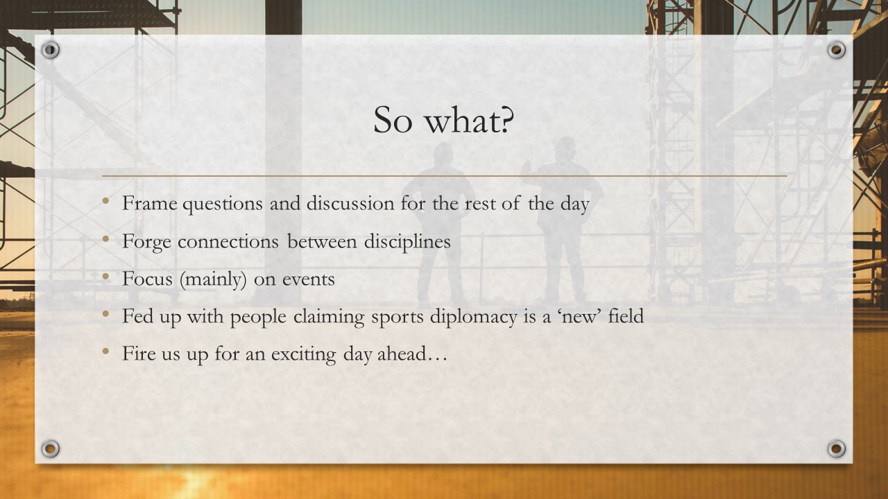 For the remainder of the day, we heard from a range of voices about how sports and/or diplomatic tenants featured in their research: