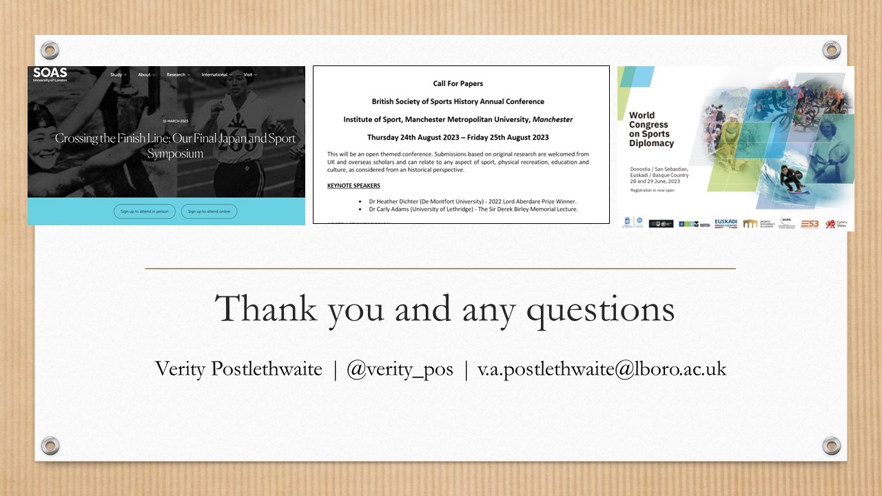 Another huge thank you to a couple of wise mentors who guided me through the process of putting together a keynote talk, in particular the signpost to the TED resource. I used the keynote slot to frame some empirical, methodological and theoretical challenges and opportunities of researching sports diplomacy, then the latter portion to illustrate these through a spotlight on the 2023 FIFA Women’s World Cup (a selection of slides here).