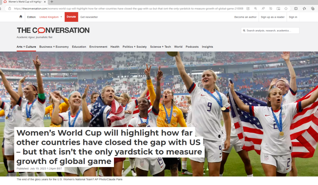 Full Conversation piece here: https://theconversation.com/womens-world-cup-will-highlight-how-far-other-countries-have-closed-the-gap-with-us-but-that-isnt-the-only-yardstick-to-measure-growth-of-global-game-210008